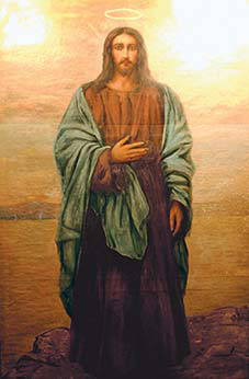 Jesus standing on the shore of the Sea of Galilee fades to a shadow
